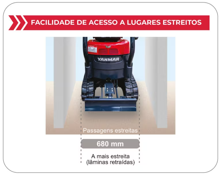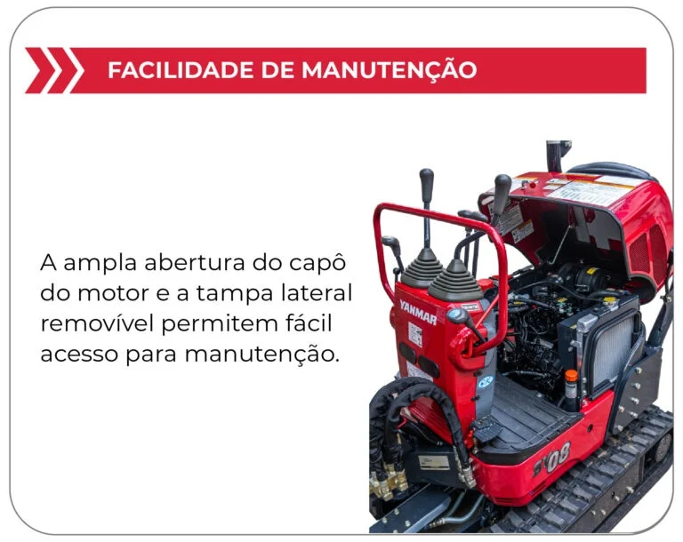 Com apenas uma tonelada, a SV08 tem potência de 10 cavalos, largura que varia entre 680 mm e 840 mm, esteira de borracha e motor diesel, modelo 402J-05 IG84555R. A junção de todas estas características permite que a máquina tenha acesso a locais estreitos uma vez que consegue passar pelo batente de uma porta sem danificar pisos e paredes proporcionado pelo seu baixo peso operacional e de suas esteiras de borracha.